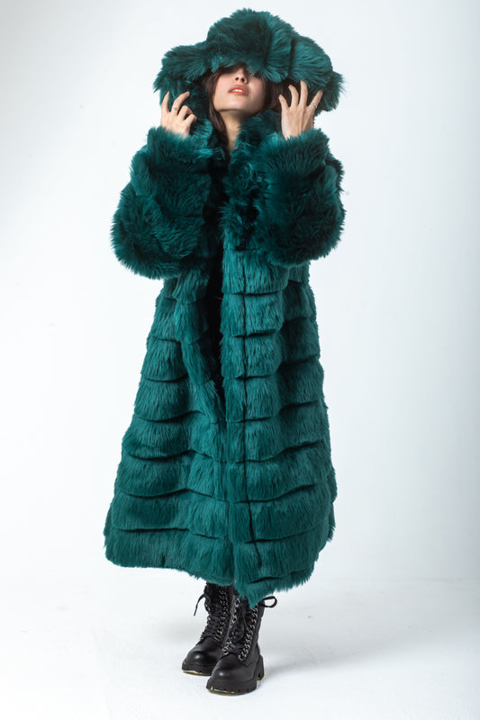 Long Striped Fur Coat With Hoodie