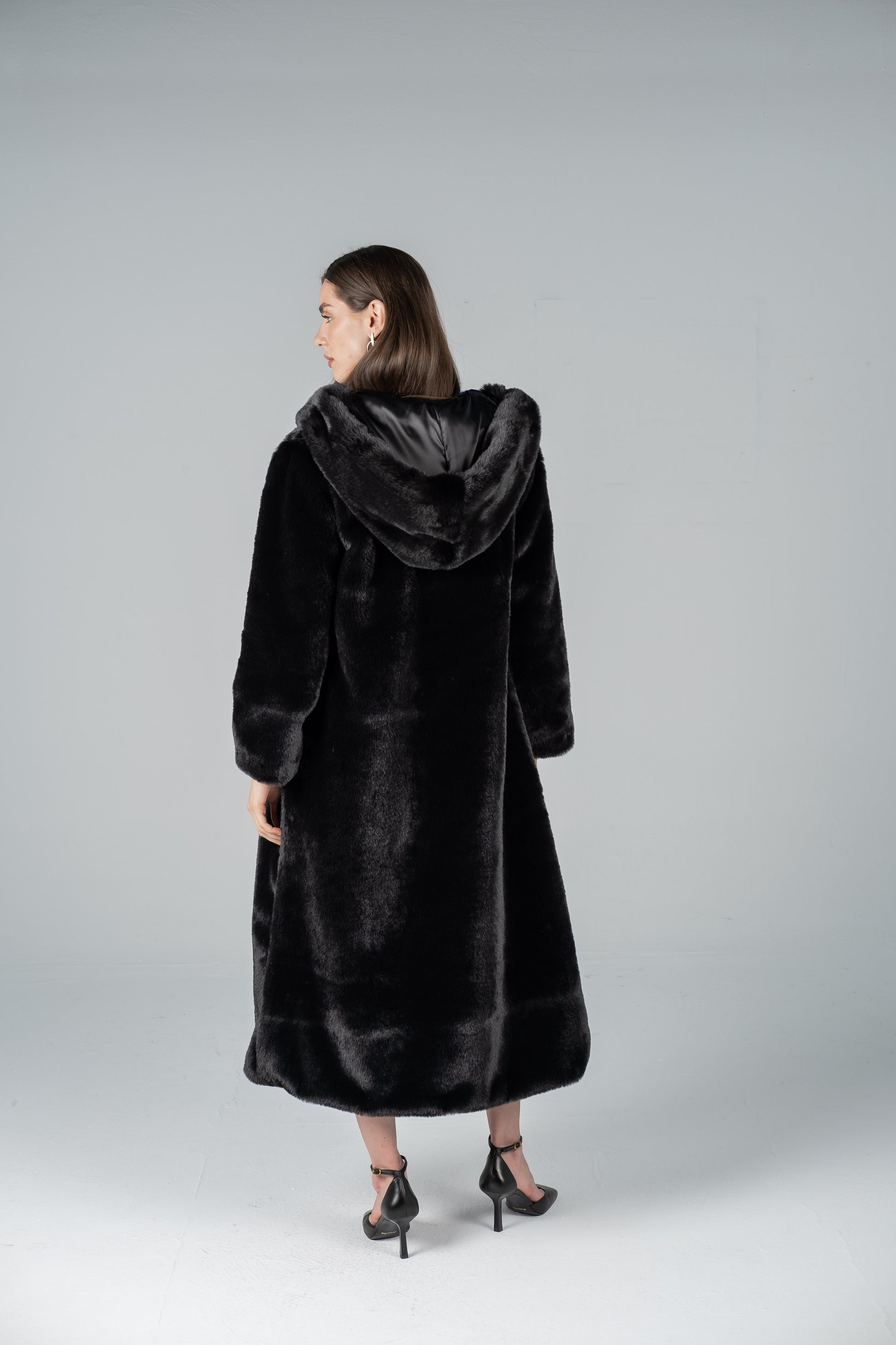 LONG HOODED BLACK FUR COAT