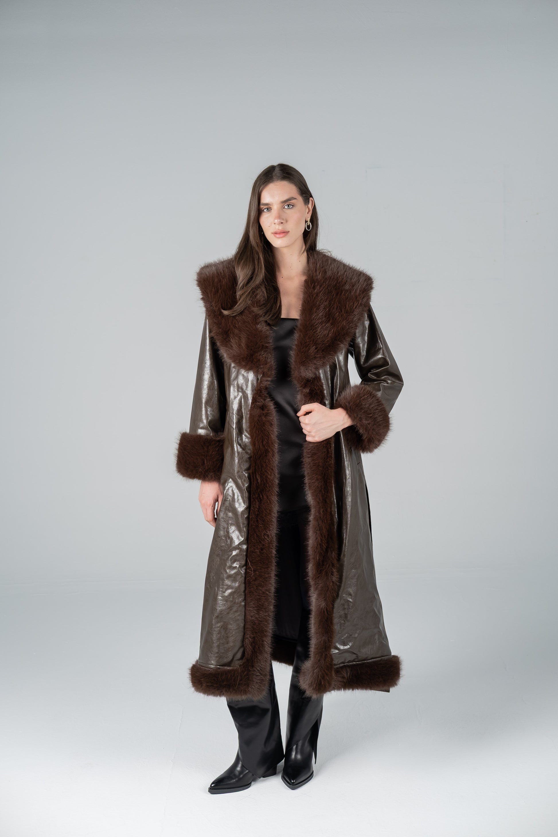 Description: A high-gloss chocolate coat trimmed in plush faux fur along the collar, sleeves, and hem. Designed to turn heads with rich contrast and dramatic length — the ultimate winter power piece.