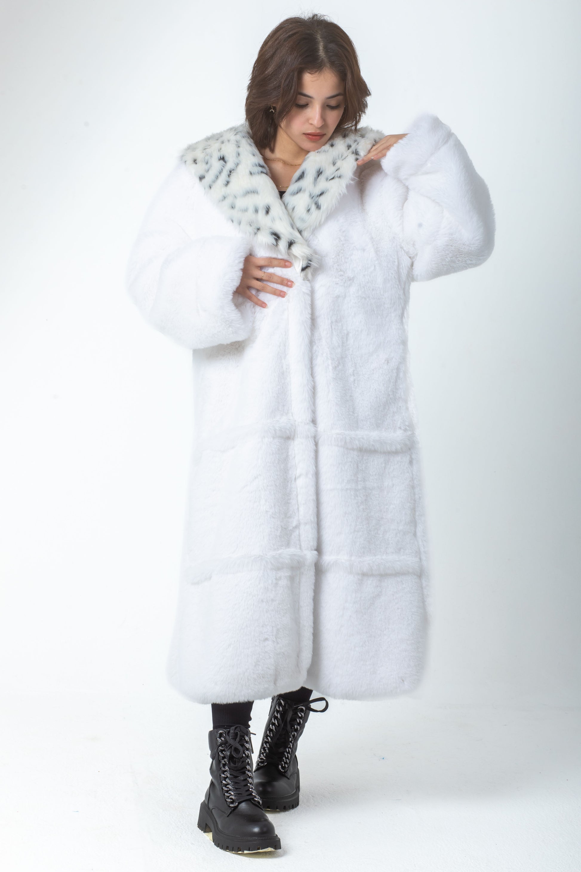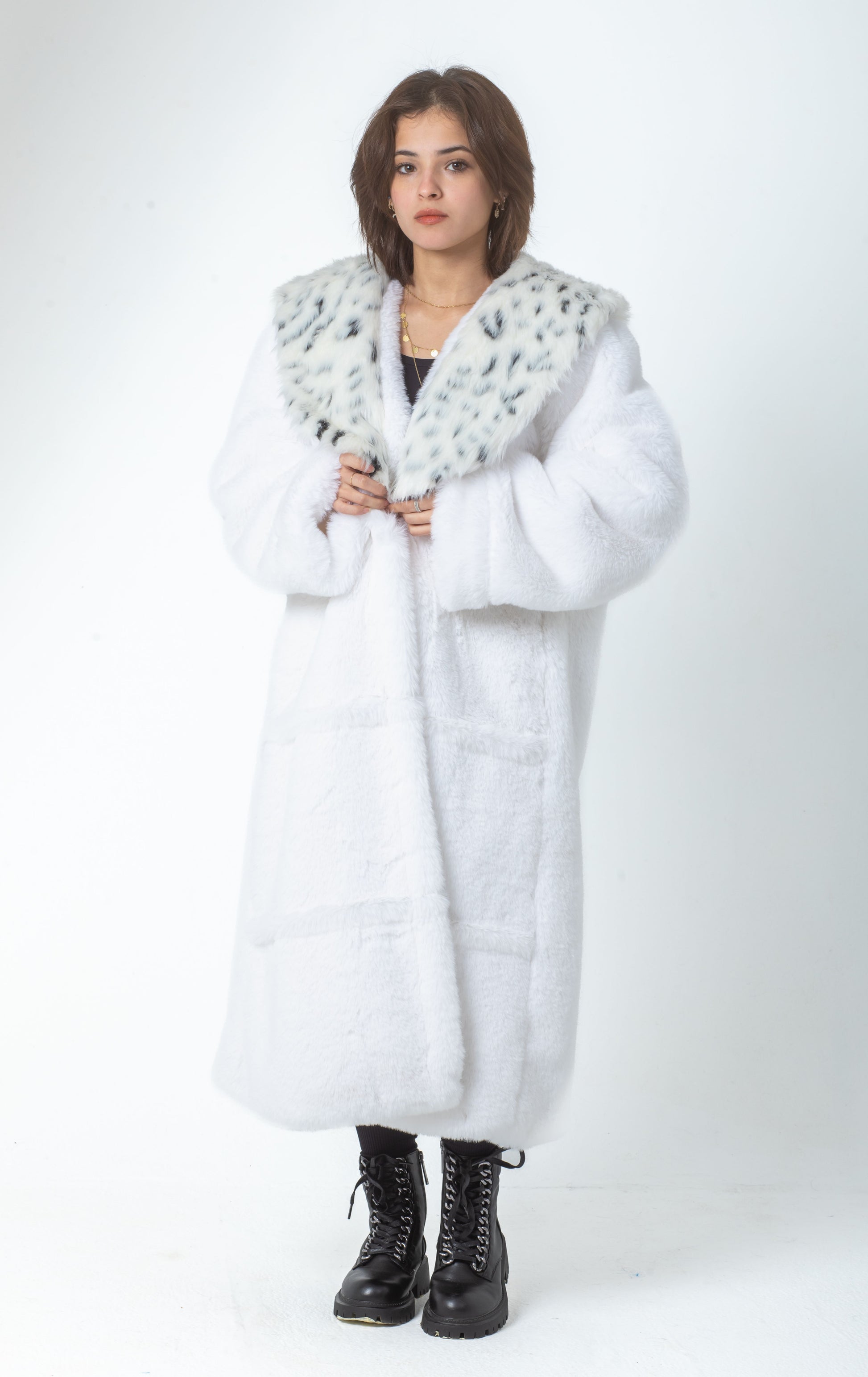 Luxurious long fur coat, featuring a striking white tiger collar. Crafted from soft fur for ultimate comfort, it also includes practical pockets, combining elegance and functionality in one statement piece.